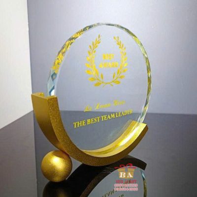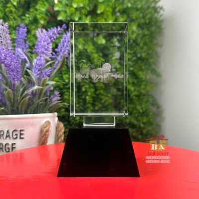 • Đặc điểm: Thân pha lê trong suốt đặt trên bệ gỗ sang trọng, thường được khắc Laser thông tin lên phần kim loại.