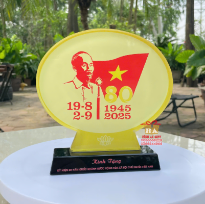 • Kỷ niệm chương pha lê in hình Bác Hồ đọc Tuyên ngôn Độc lập – một thiết kế giản dị, trang trọng, phù hợp để trưng bày trong phòng họp, phòng truyền thống hoặc làm quà lưu niệm.
