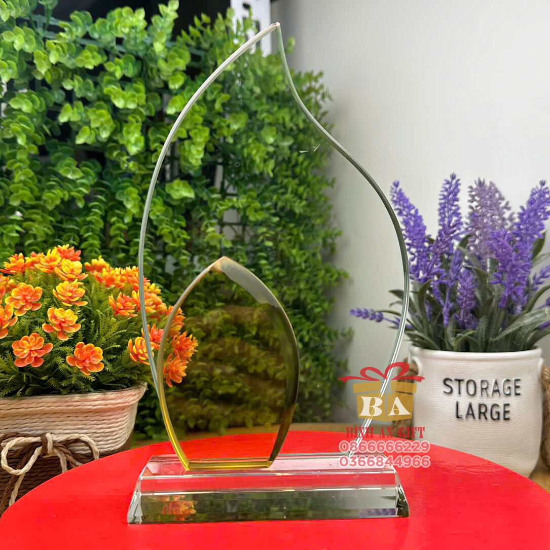 - Logo Công ty TNHH Sản Xuất Quà Tặng Bích Phượng in nổi, nền pha lê trong suốt kết hợp đế đen sang trọng.