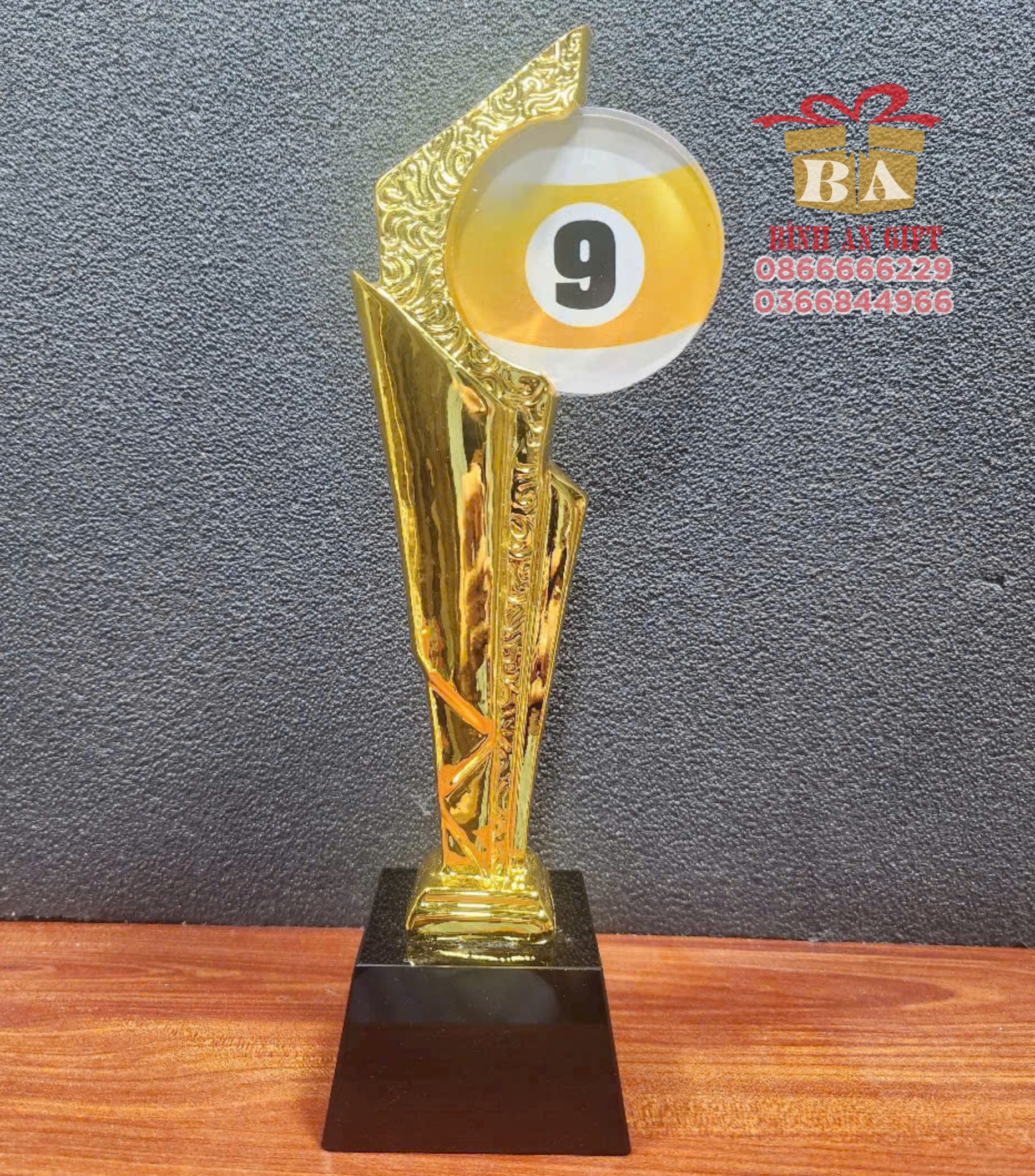Tại Quà Tặng Bình An, mẫu cúp bida số 9 này gây ấn tượng với kiểu dáng phá cách, hiện đại, lấy cảm hứng từ đường nét sắc sảo và tinh thần chinh phục trong thể thao.