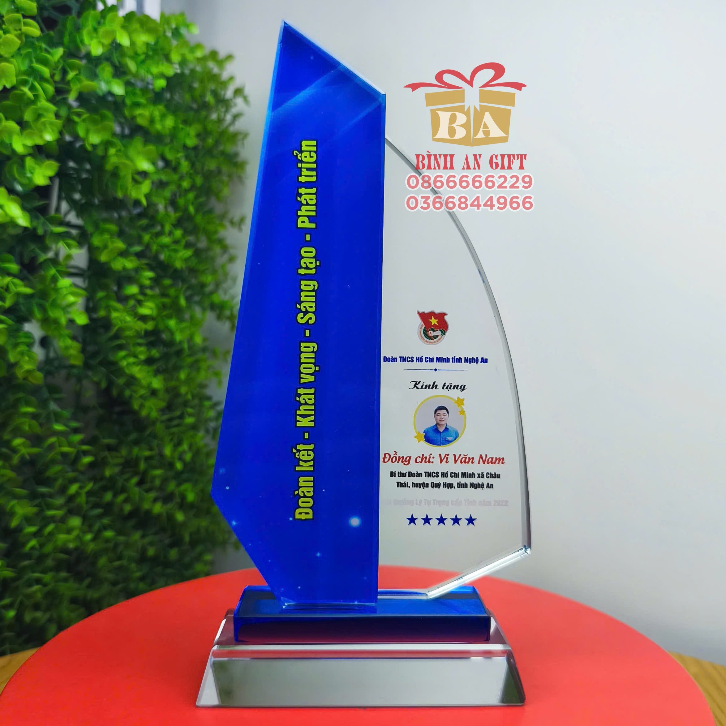 Chiếc cúp pha lê xanh dương được thiết kế độc đáo, mang ý nghĩa của sự đoàn kết, khát vọng và sáng tạo. Đây là biểu trưng tôn vinh xứng đáng những cá nhân, tập thể xuất sắc trong công tác Đoàn – Hội, góp phần lan tỏa tinh thần nhiệt huyết tuổi trẻ.