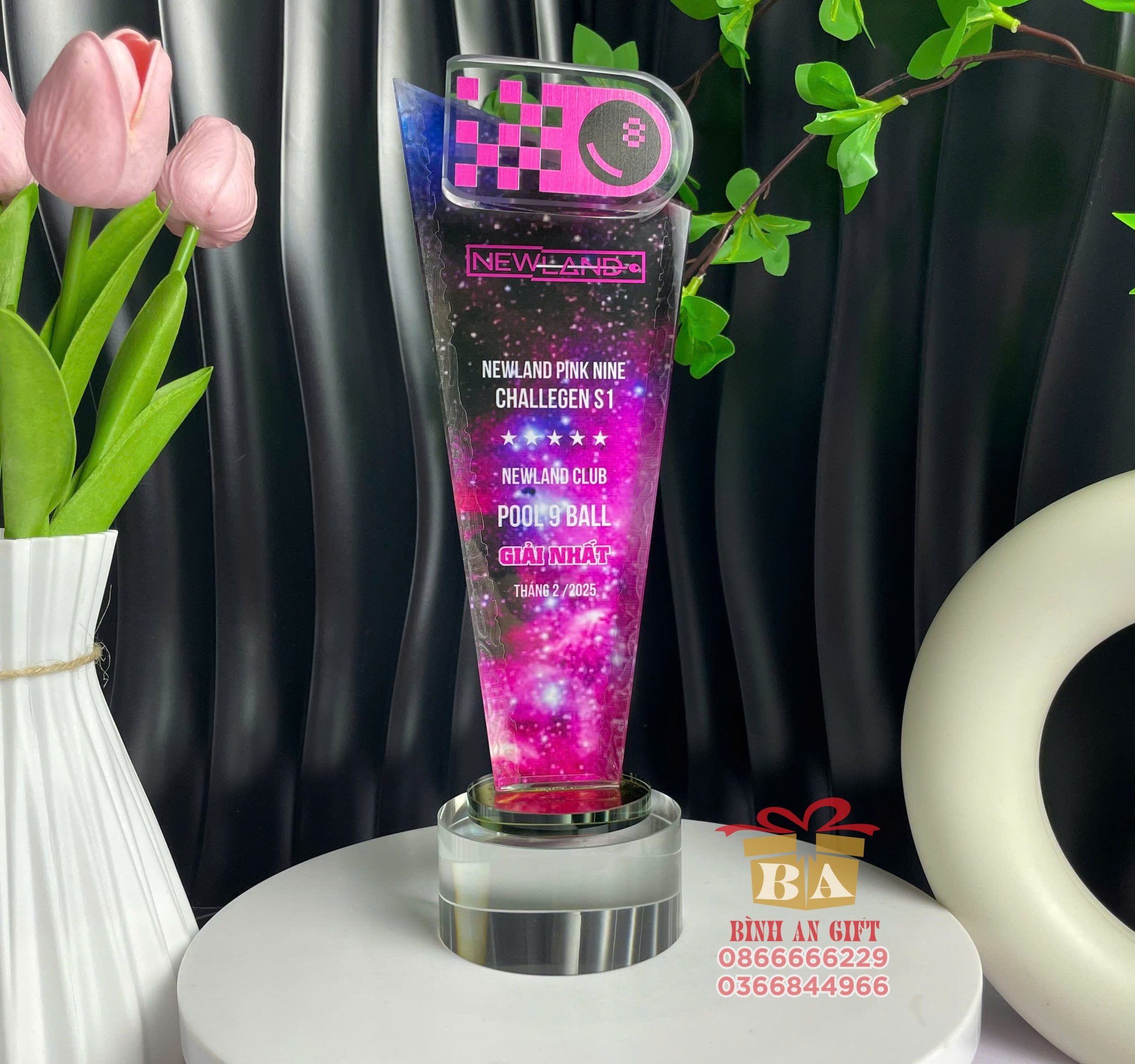 Chiếc cúp pha lê Newland Club là mẫu thiết kế độc quyền mang đậm phong cách hiện đại, rực rỡ và cá tính. Đây là món quà vinh danh nhà vô địch bộ môn bida (Pool 9 Ball) – tượng trưng cho bản lĩnh, kỹ năng và tinh thần thể thao rực cháy.