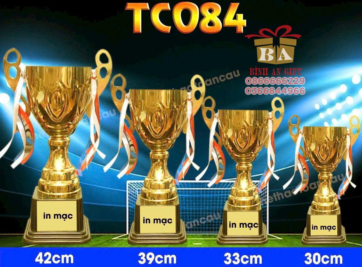 Tại Quà Tặng Bình An, mẫu TC084 mang kiểu dáng truyền thống với thân cúp thẳng, bầu tròn mạ vàng sáng bóng, kết hợp quai cầm bản lớn, tạo cảm giác chắc chắn và mạnh mẽ.