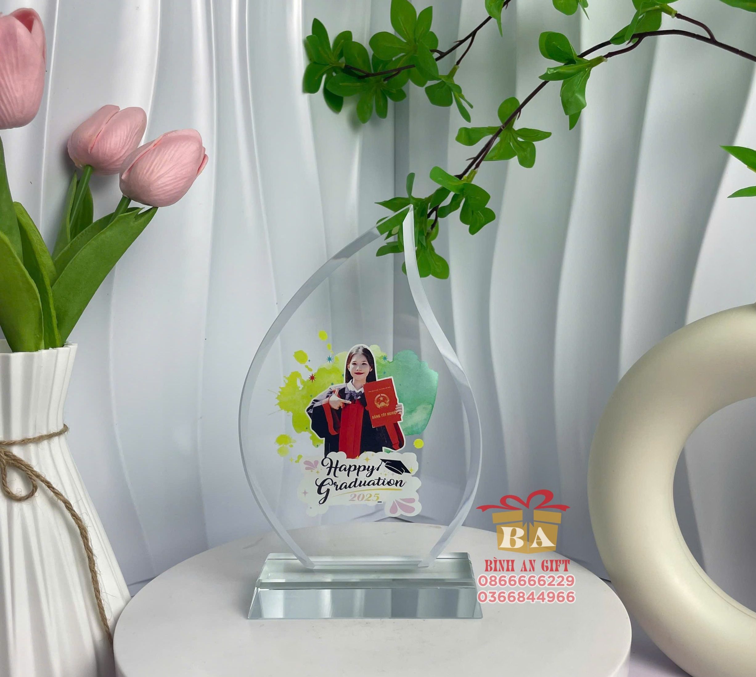 - Hình ảnh tân cử nhân tươi cười cầm bằng tốt nghiệp, được in nổi bật giữa khối pha lê trong suốt, mang đến cảm giác sống động và tràn đầy năng lượng.