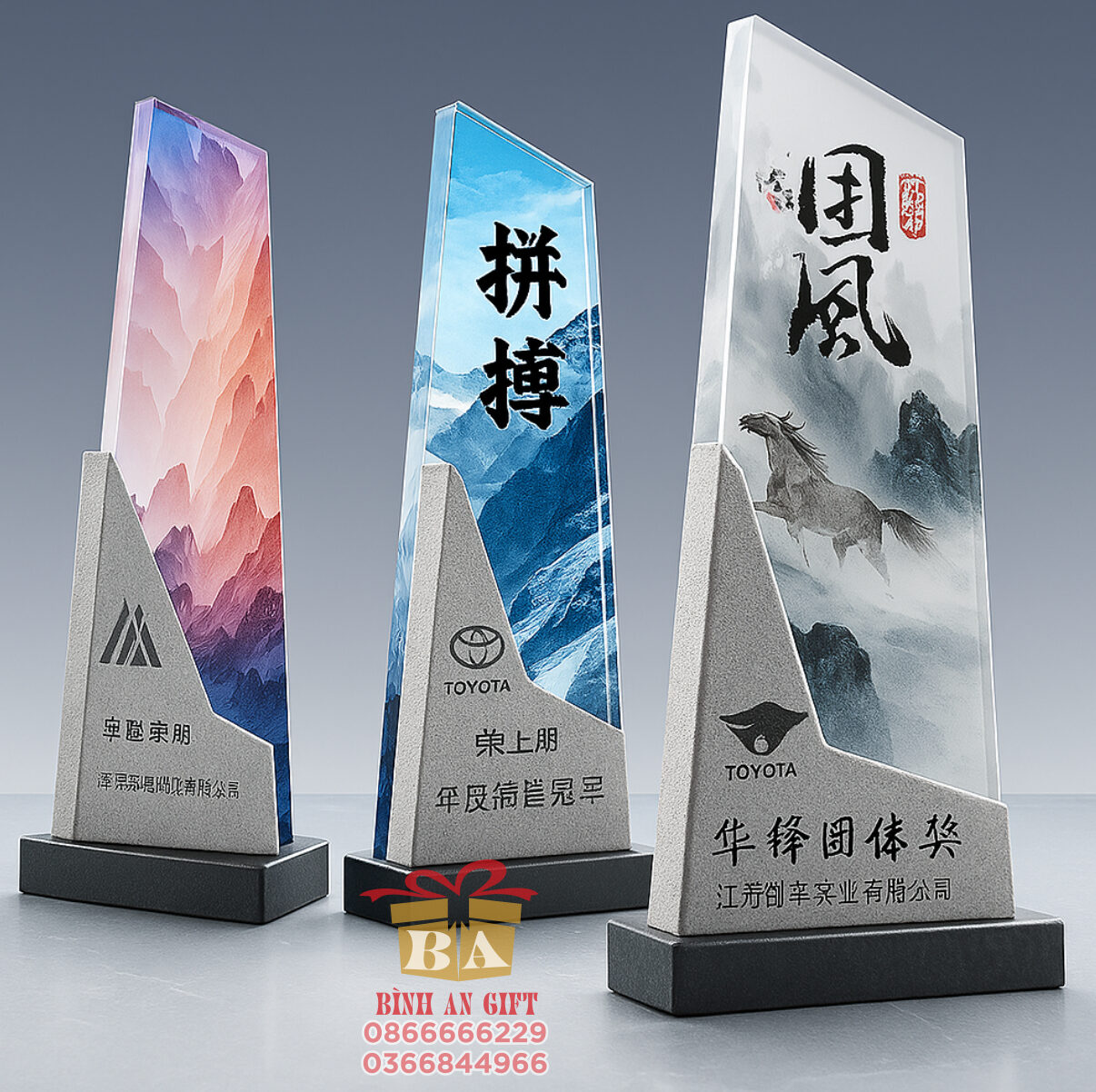 - Phần đế và chân đỡ bằng đá nhân tạo, thiết kế vững chãi, có thể khắc logo, tên người nhận, doanh nghiệp.