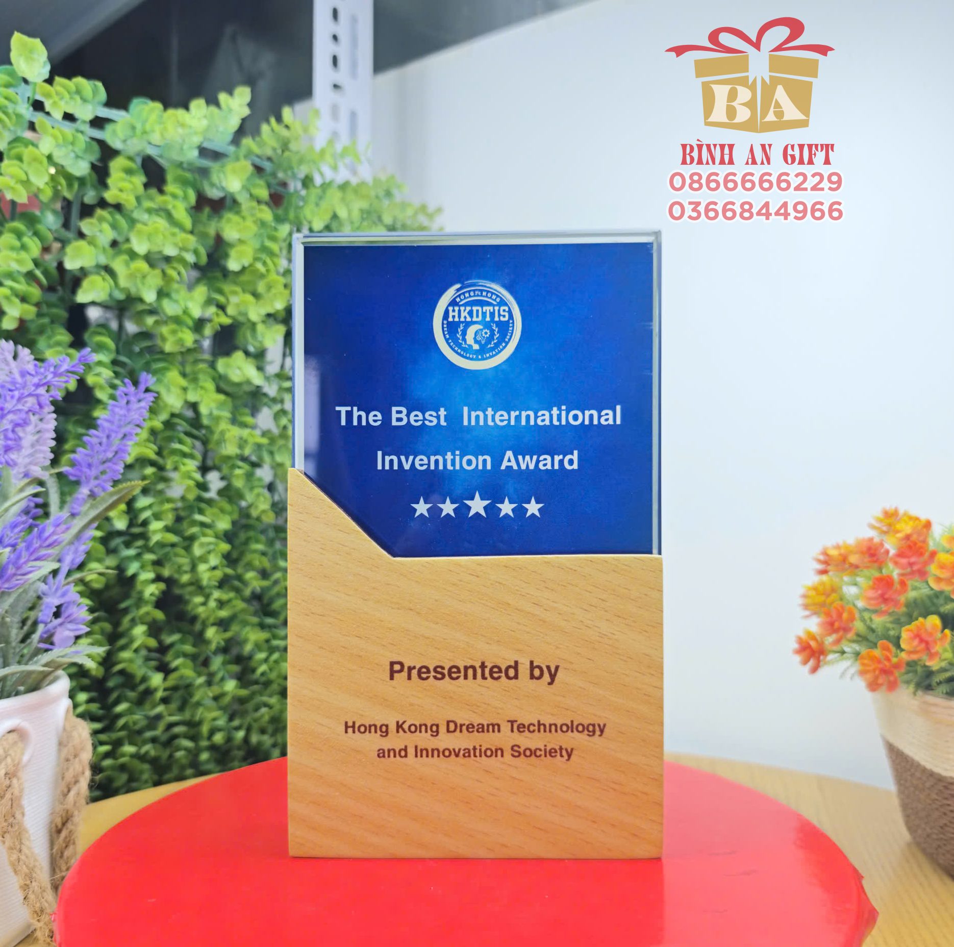 Mẫu kỷ niệm chương được kết hợp từ mặt gỗ cao cấp và Pha lê in màu tạo hiệu ứng sang trọng, sắc nét. Phần nền xanh dương nổi bật kèm logo và nội dung in UV bền màu, chống phai.