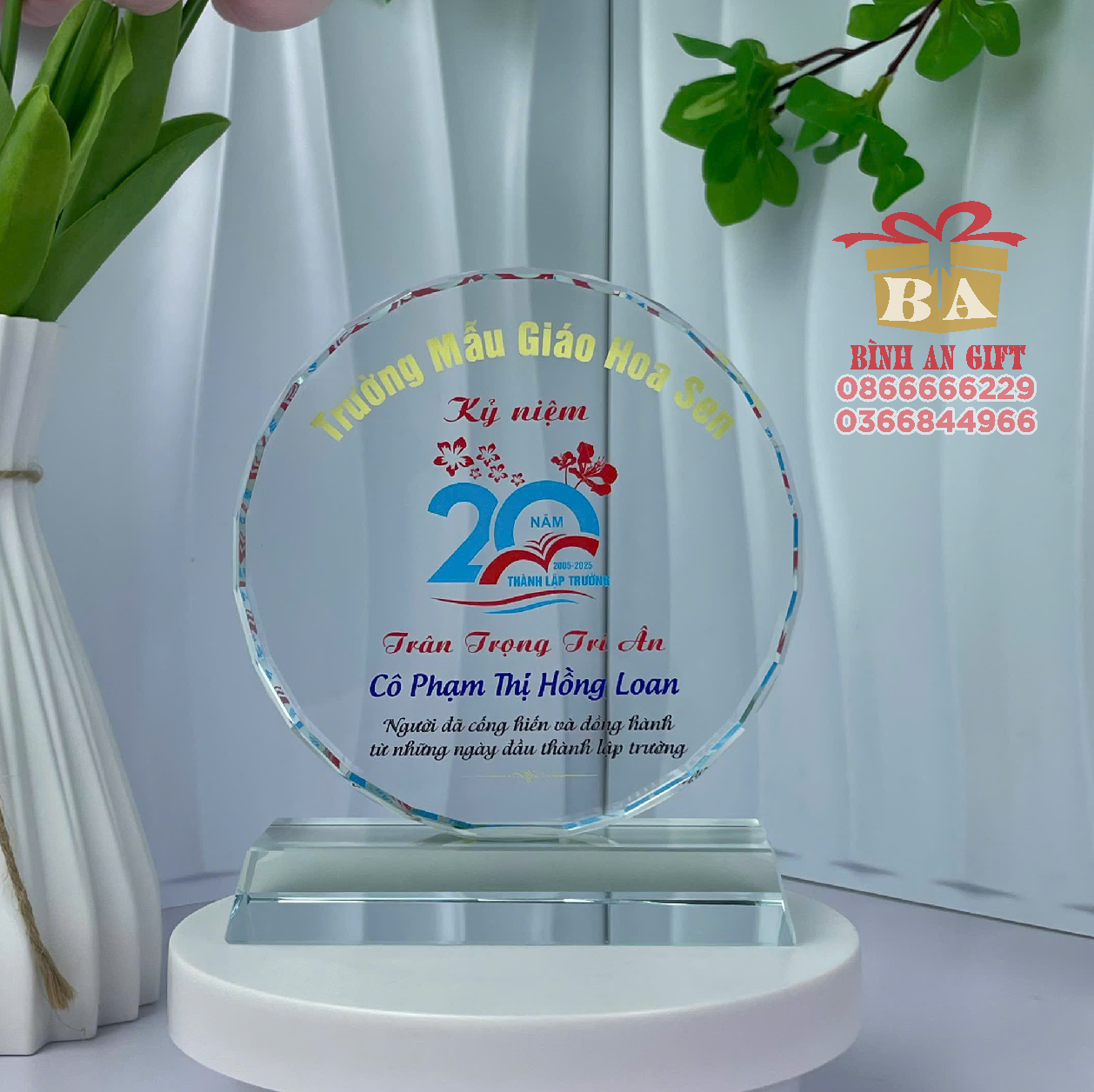 - Hình khối tròn pha lê trong suốt tượng trưng cho sự trọn vẹn, bền vững của tình bạn và ký ức học trò.