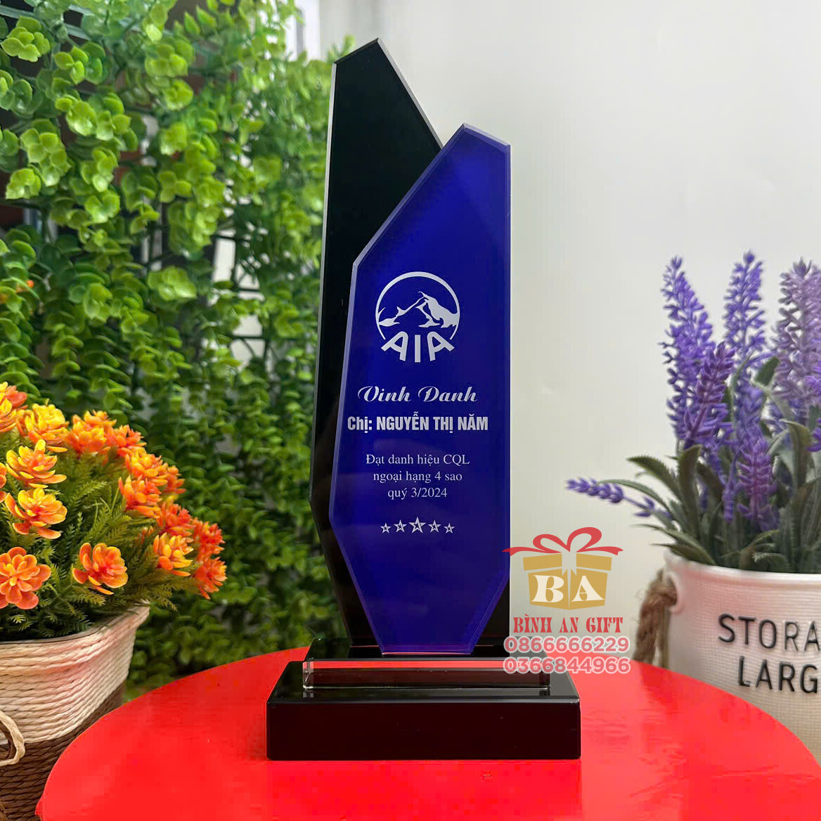 - Phần chân đế pha lê trong suốt khắc thông điệp: